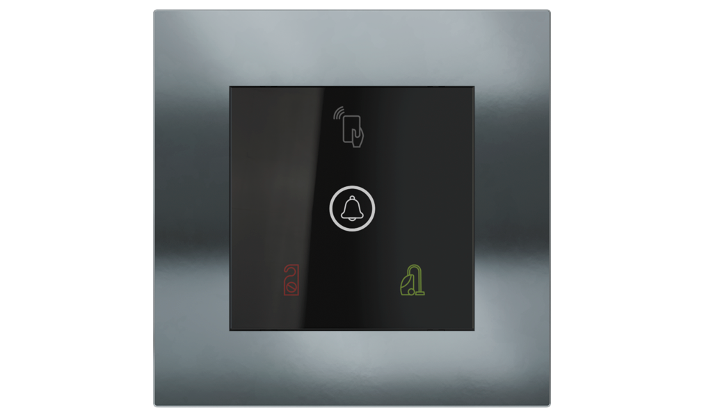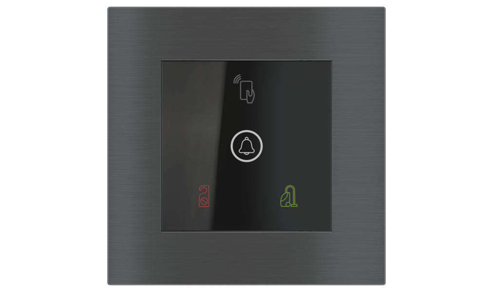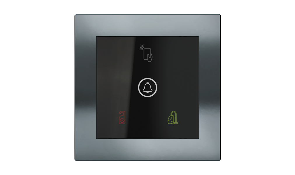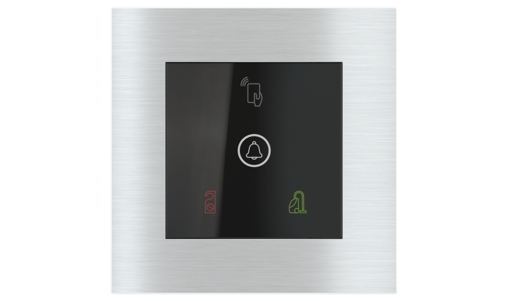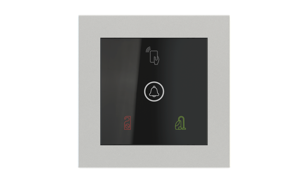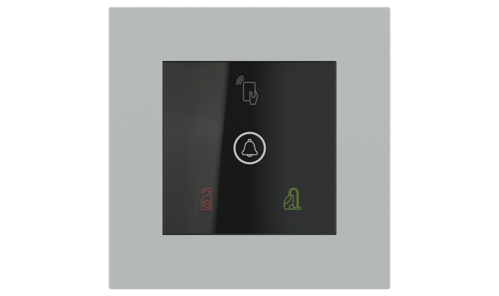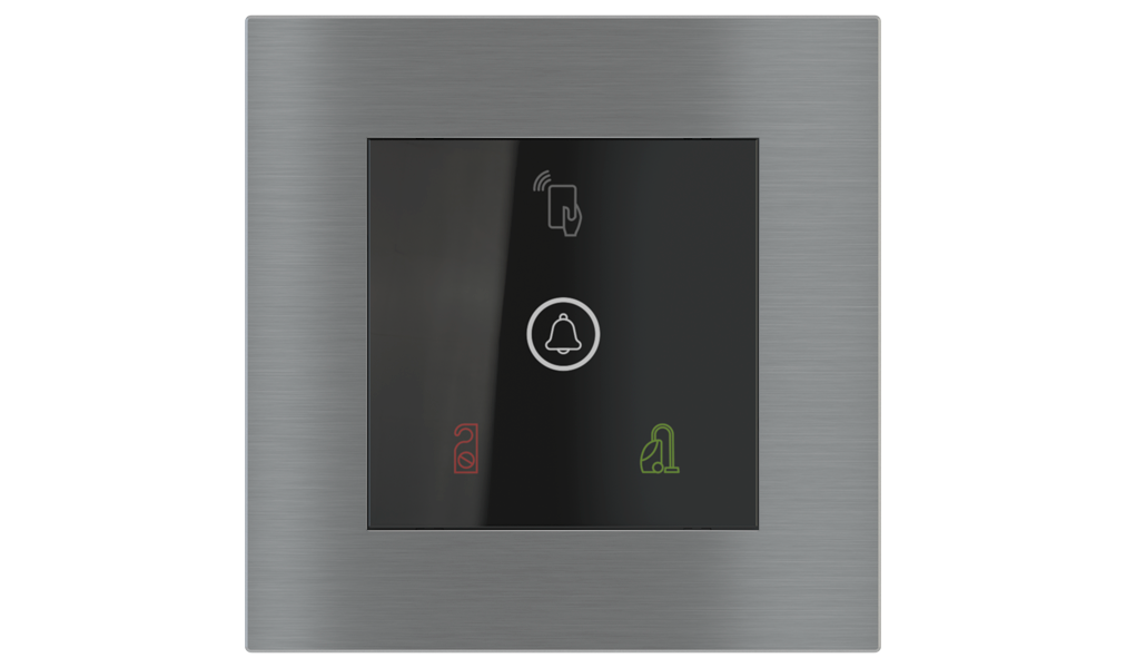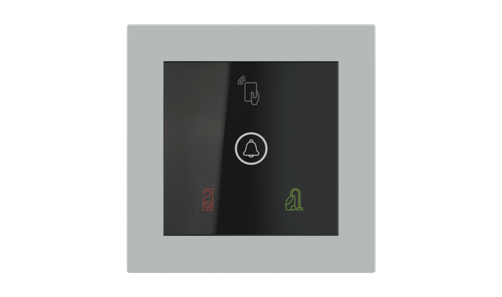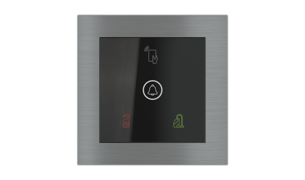 Vonkajšia čítačka, inštalovaná pri vstupe do izby, slúži na autorizáciu hostí aj personálu. Šifrovaná komunikácia KNX Secure zabezpečuje maximálnu ochranu proti neoprávnenému zásahu do systému. Podsvietený displej prehľadne zobrazuje stavové symboly DND – Nerušit (červená LED) a MUR – Úklid izby (zelená LED). Súčasťou je aj programovateľná RGB LED signalizácia a integrované tlačidlo zvončeka.