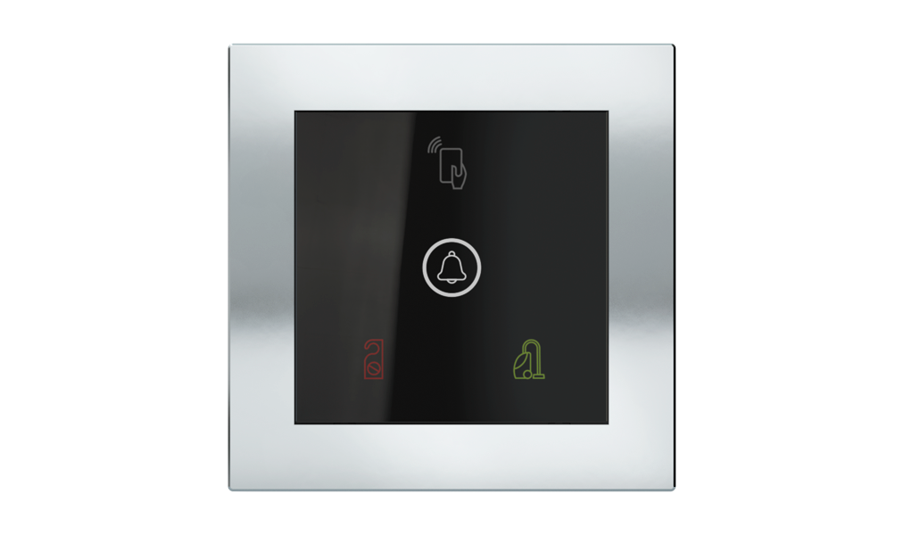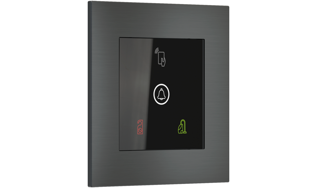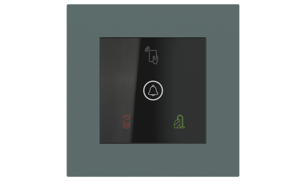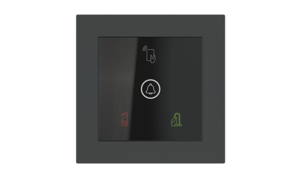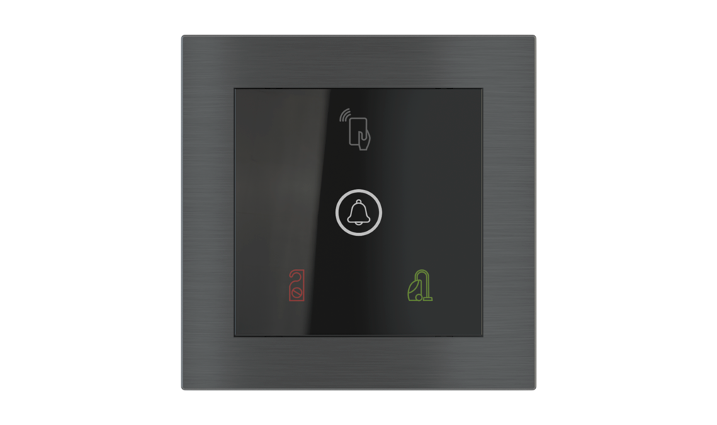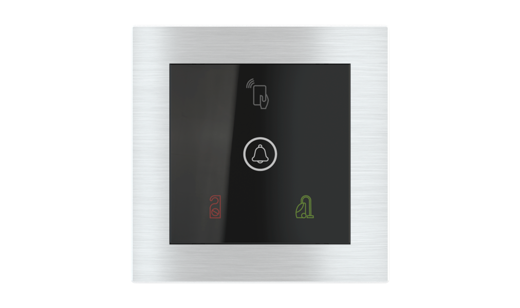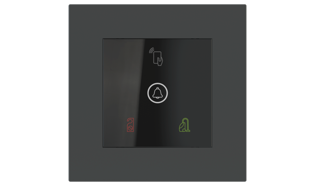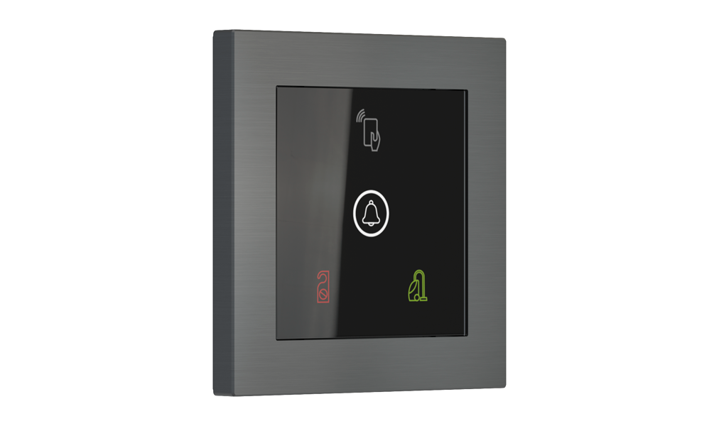 Vonkajšia čítačka, inštalovaná pri vstupe do izby, slúži na autorizáciu hostí aj personálu. Šifrovaná komunikácia KNX Secure zabezpečuje maximálnu ochranu proti neoprávnenému zásahu do systému. Podsvietený displej prehľadne zobrazuje stavové symboly DND – Nerušit (červená LED) a MUR – Úklid izby (zelená LED). Súčasťou je aj programovateľná RGB LED signalizácia a integrované tlačidlo zvončeka.