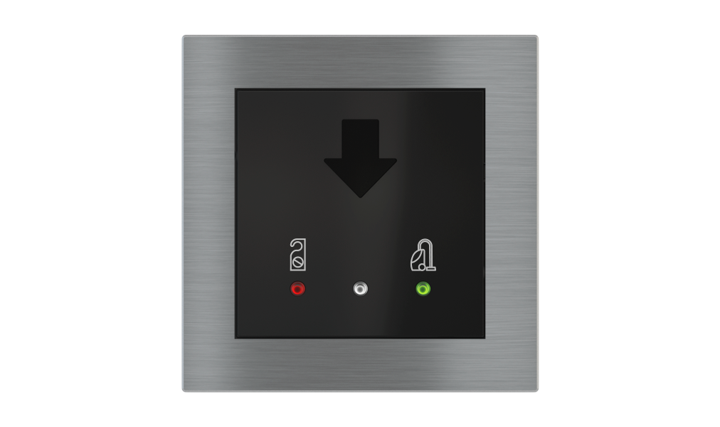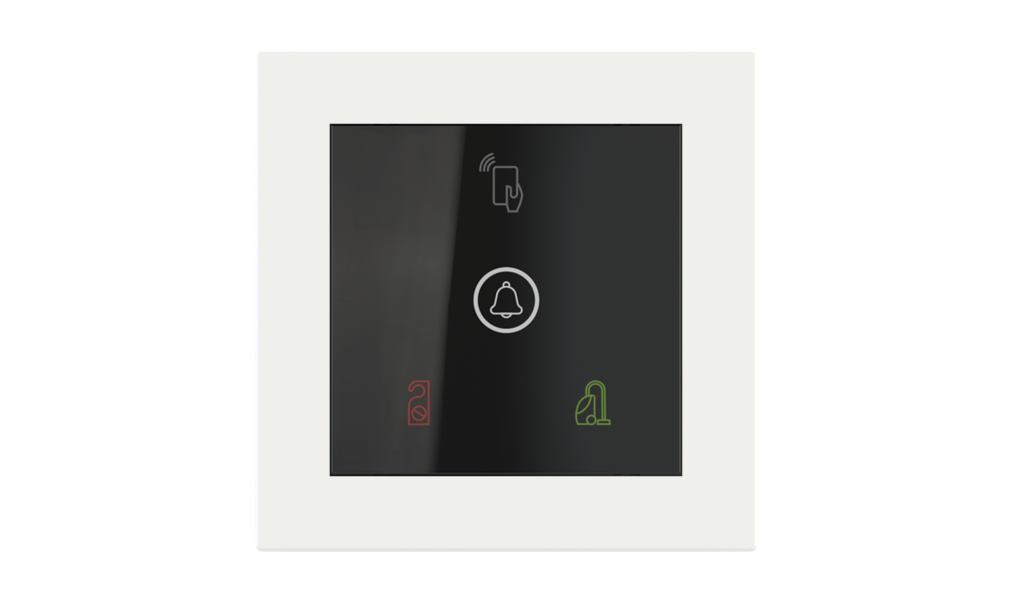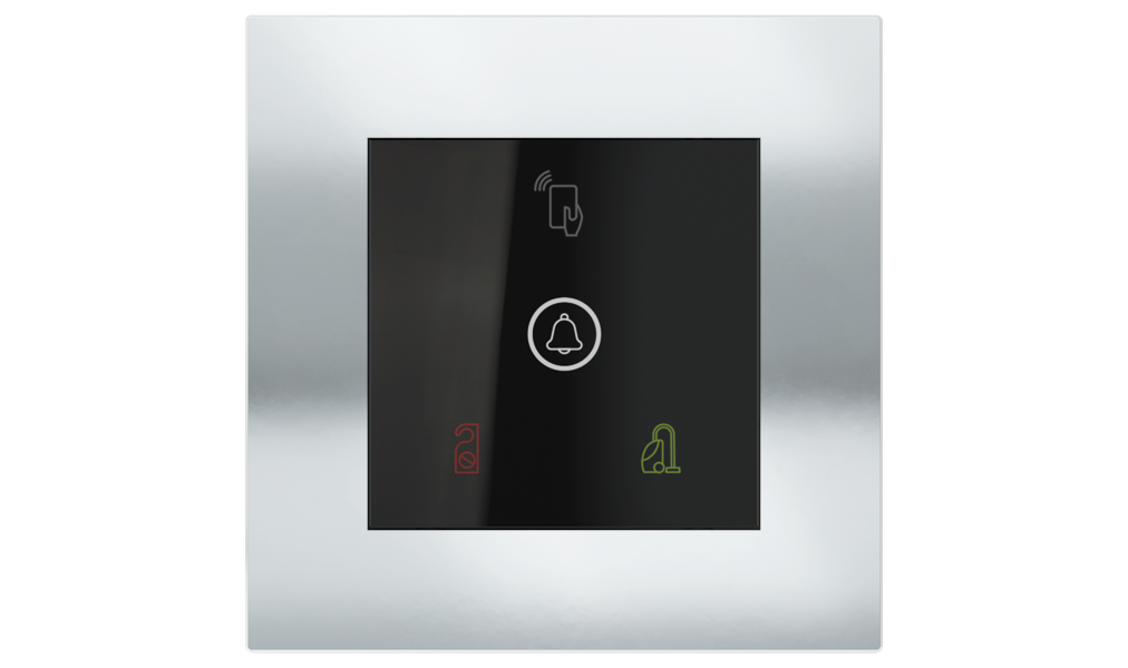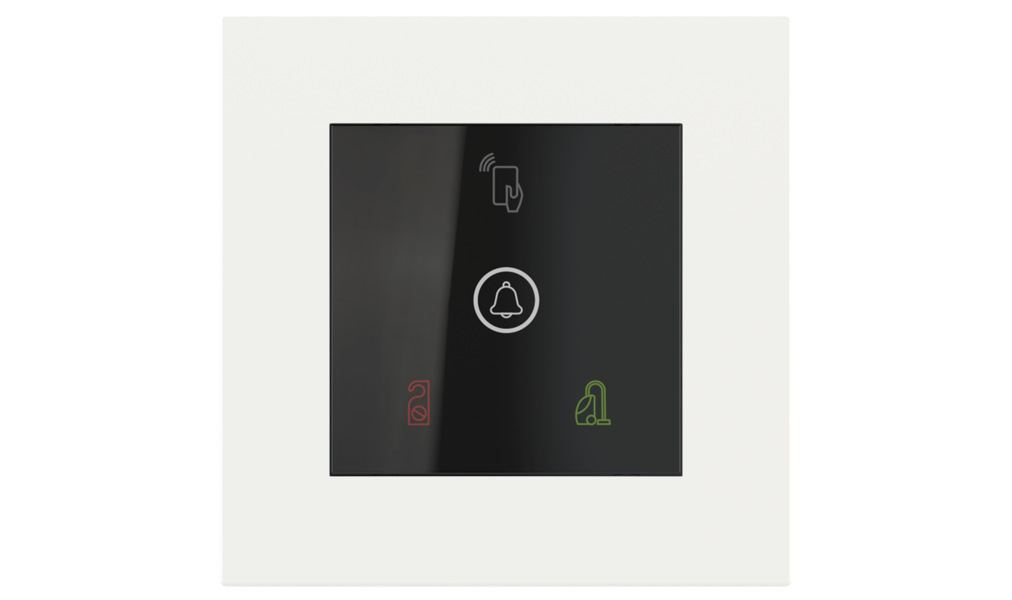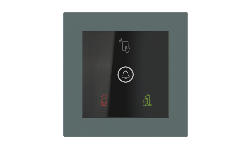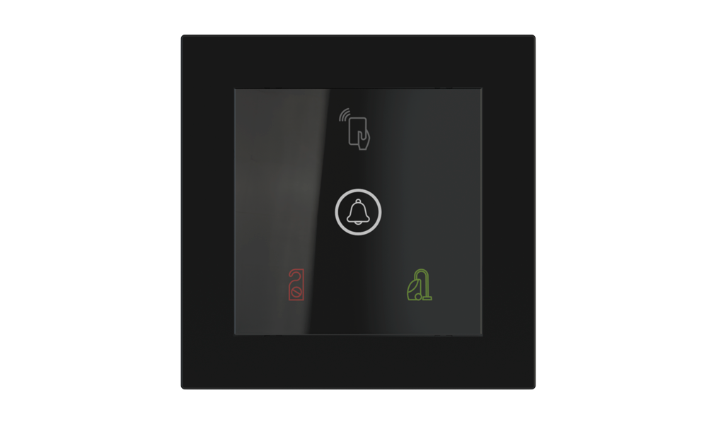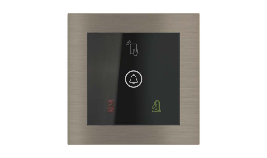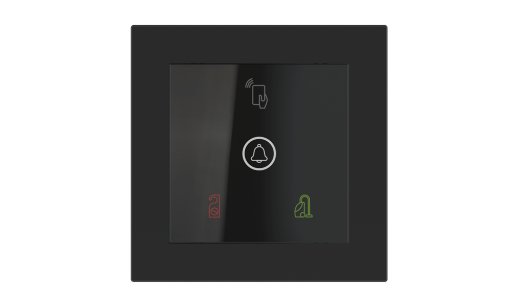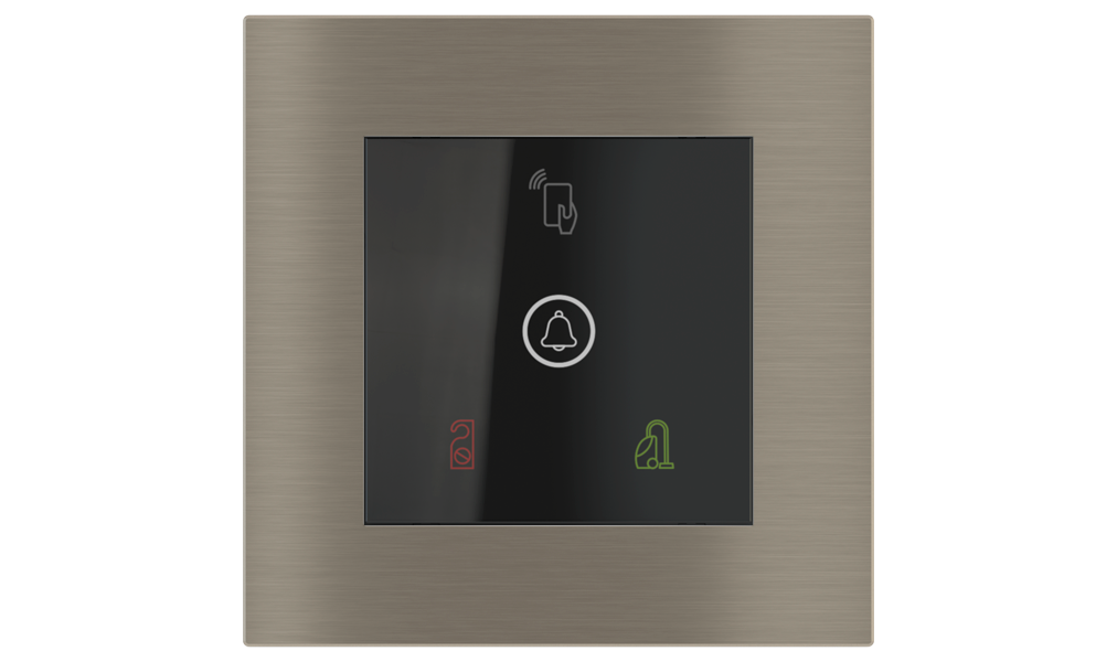 Vonkajšia čítačka, inštalovaná pri vstupe do izby, slúži na autorizáciu hostí aj personálu. Šifrovaná komunikácia KNX Secure zabezpečuje maximálnu ochranu proti neoprávnenému zásahu do systému. Podsvietený displej prehľadne zobrazuje stavové symboly DND – Nerušit (červená LED) a MUR – Úklid izby (zelená LED). Súčasťou je aj programovateľná RGB LED signalizácia a integrované tlačidlo zvončeka.