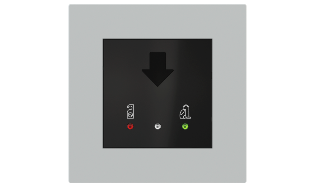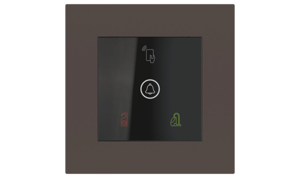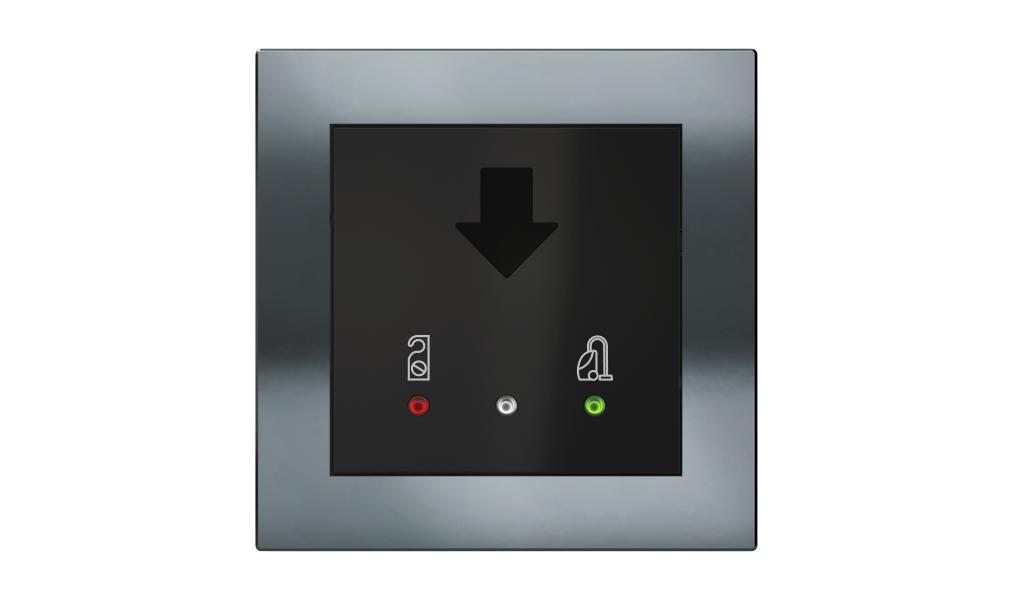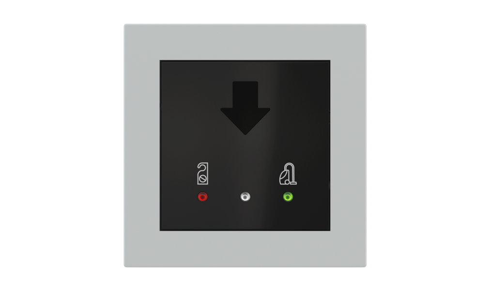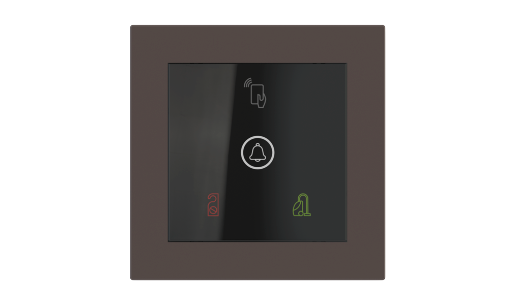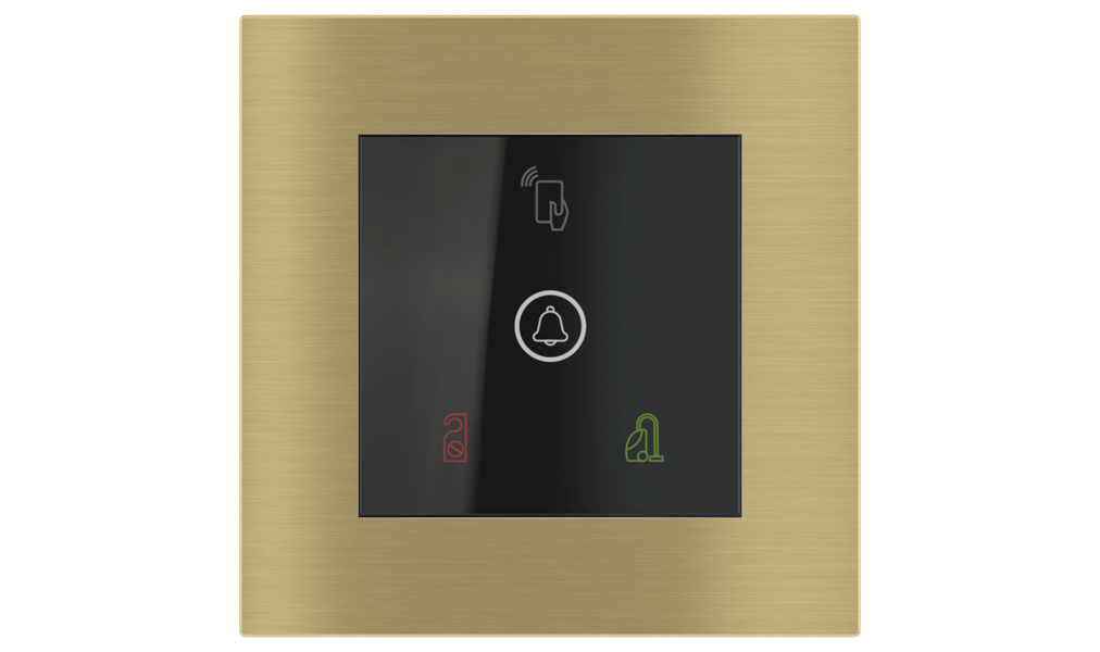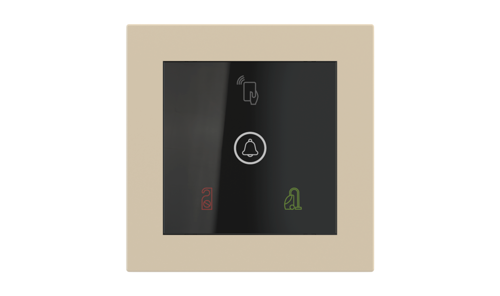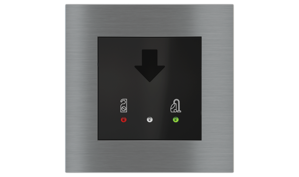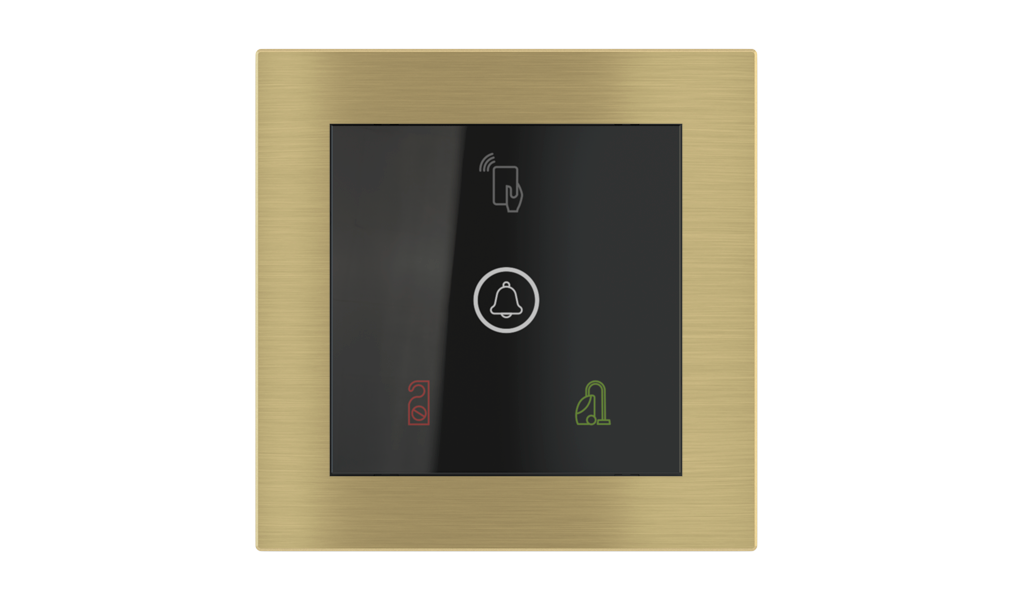 Vonkajšia čítačka, inštalovaná pri vstupe do izby, slúži na autorizáciu hostí aj personálu. Šifrovaná komunikácia KNX Secure zabezpečuje maximálnu ochranu proti neoprávnenému zásahu do systému. Podsvietený displej prehľadne zobrazuje stavové symboly DND – Nerušit (červená LED) a MUR – Úklid izby (zelená LED). Súčasťou je aj programovateľná RGB LED signalizácia a integrované tlačidlo zvončeka.