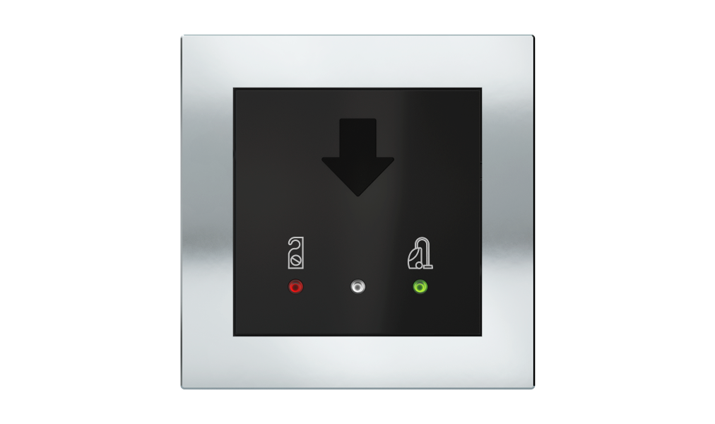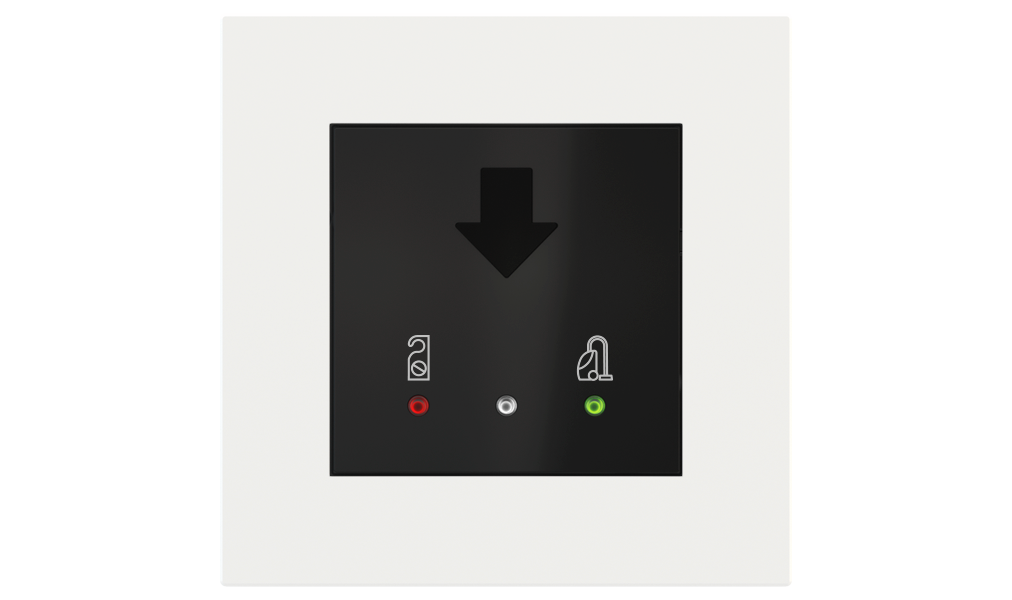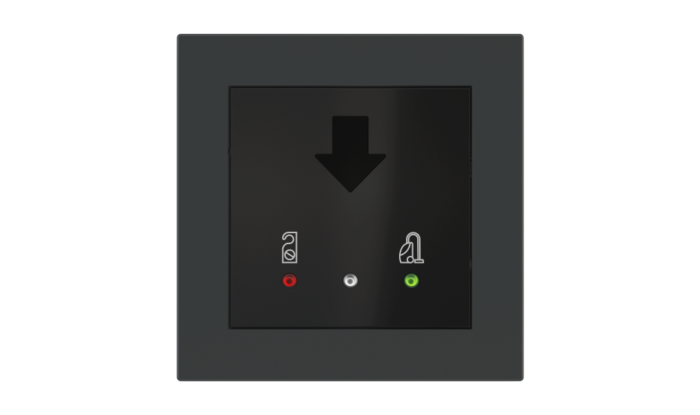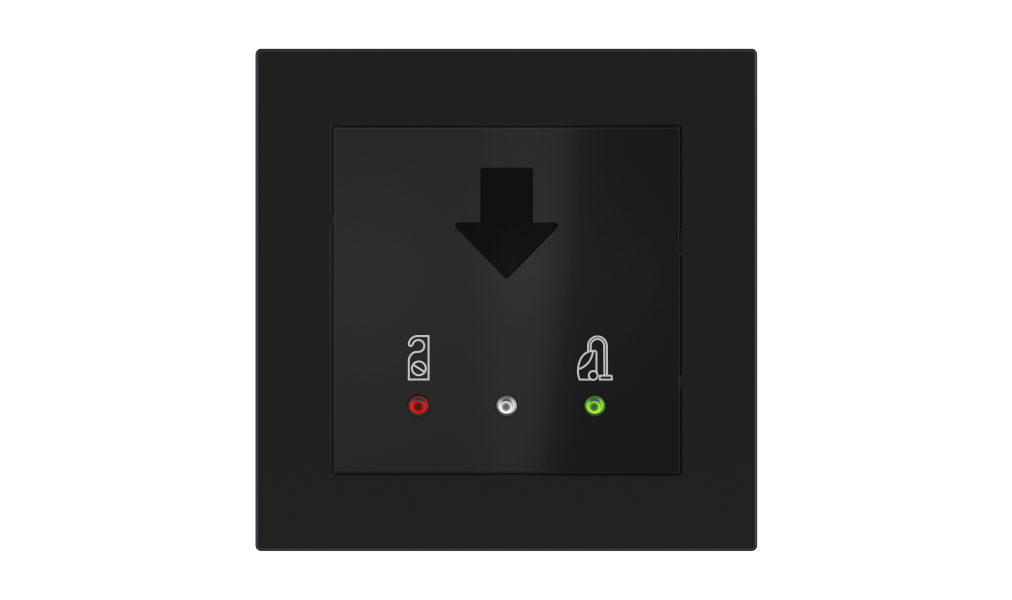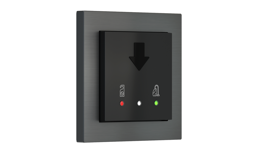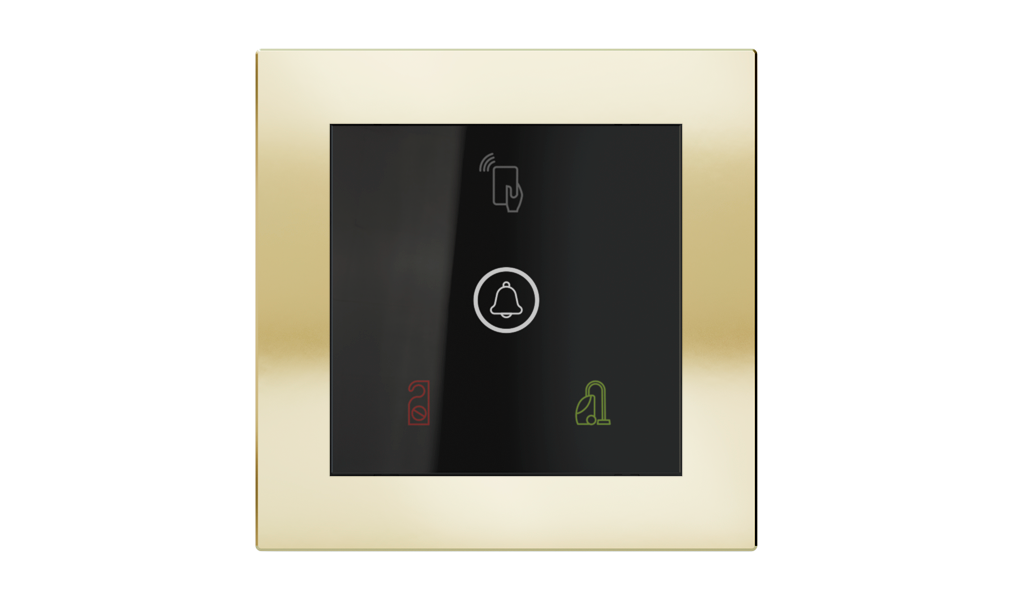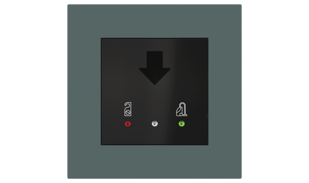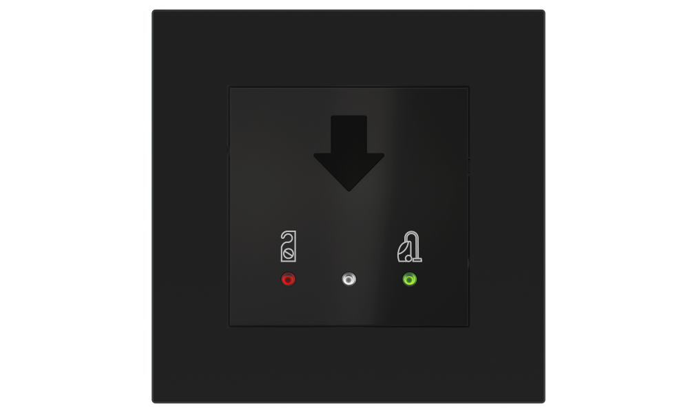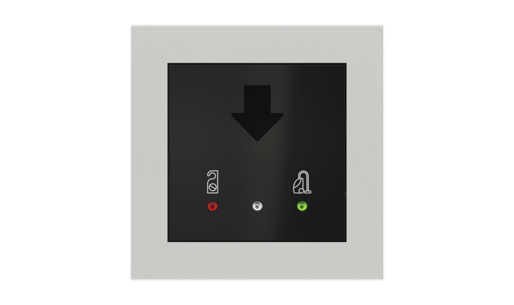Vonkajšia čítačka, inštalovaná pri vstupe do izby, slúži na autorizáciu hostí aj personálu. Šifrovaná komunikácia KNX Secure zabezpečuje maximálnu ochranu proti neoprávnenému zásahu do systému. Podsvietený displej prehľadne zobrazuje stavové symboly DND – Nerušit (červená LED) a MUR – Úklid izby (zelená LED). Súčasťou je aj programovateľná RGB LED signalizácia a integrované tlačidlo zvončeka.