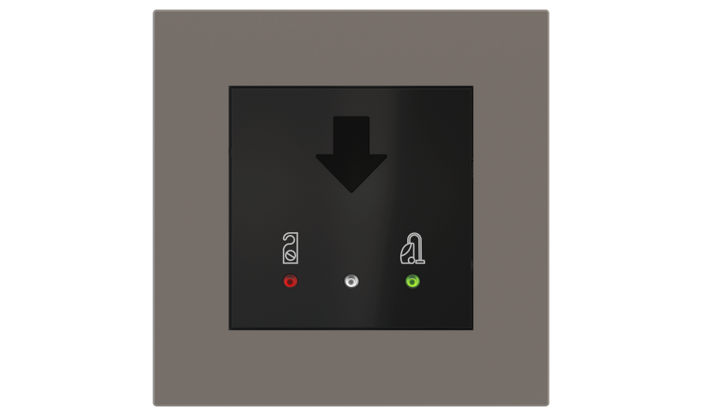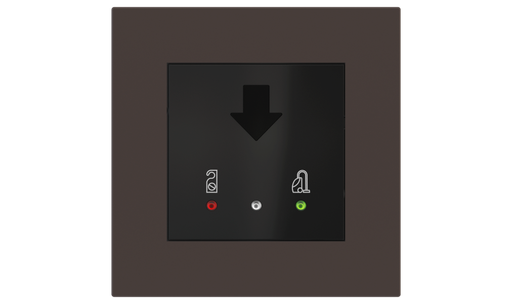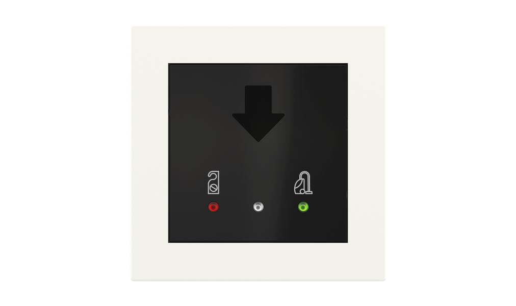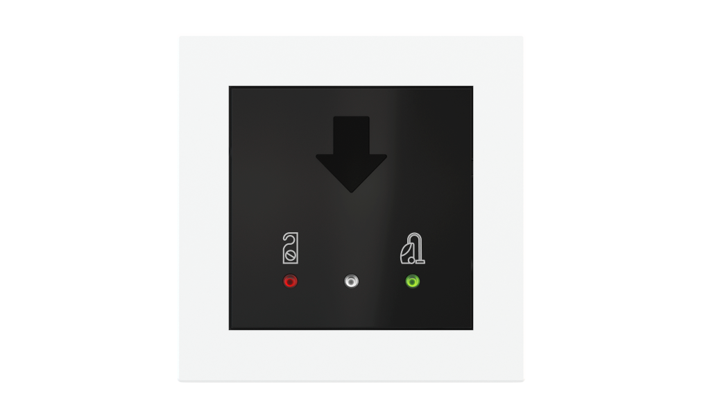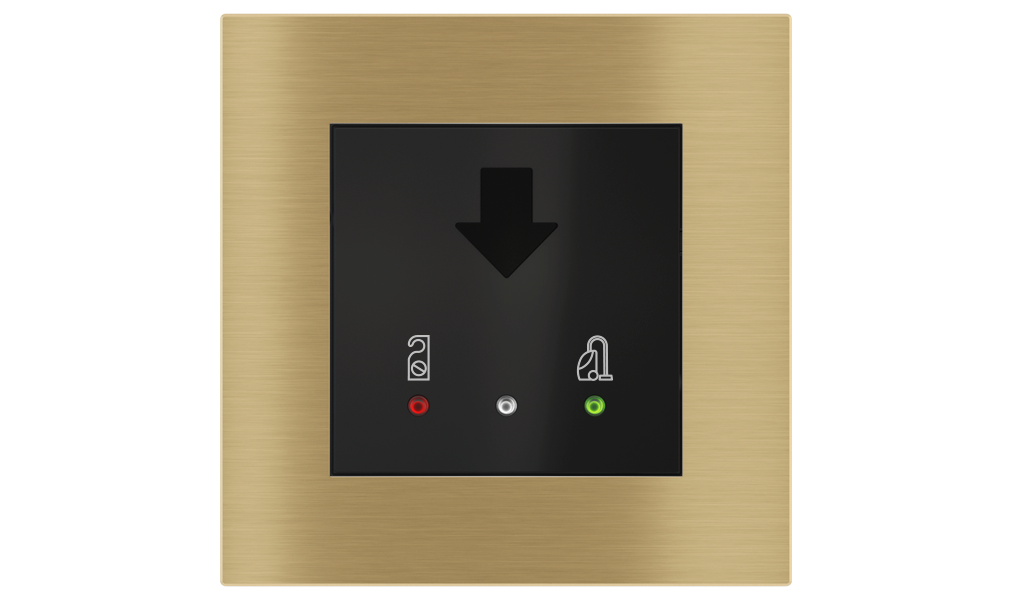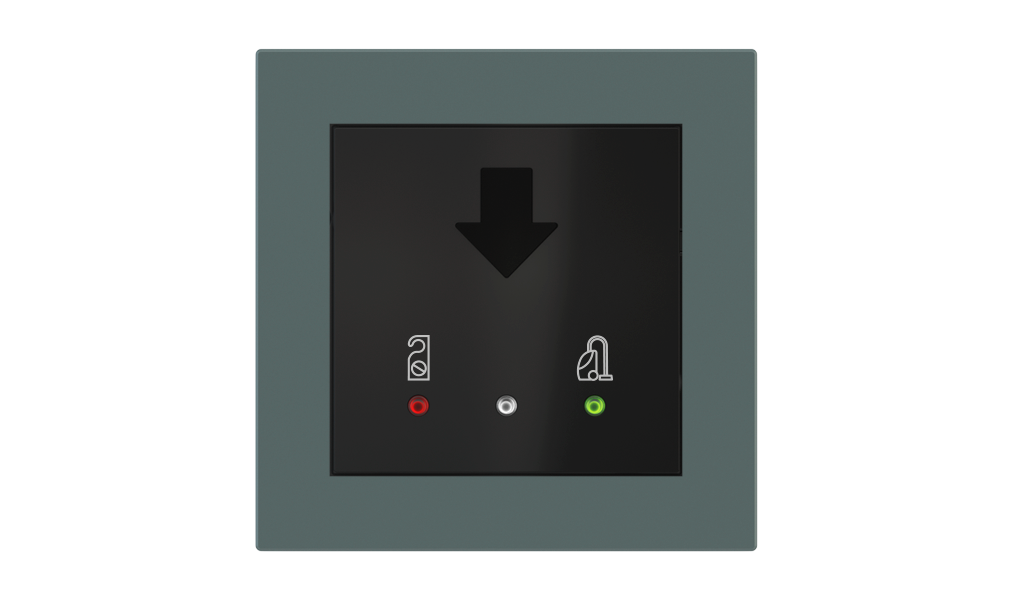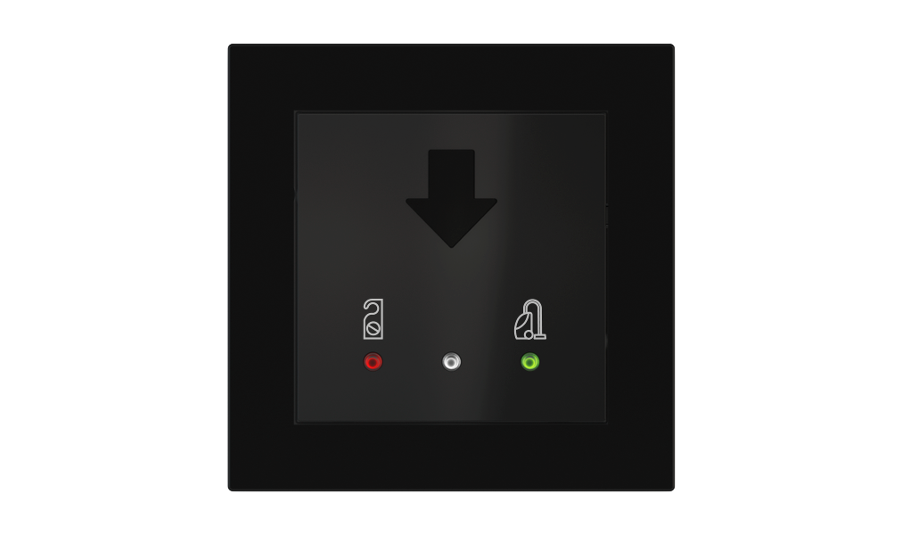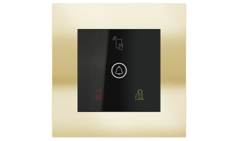 Vonkajšia čítačka, inštalovaná pri vstupe do izby, slúži na autorizáciu hostí aj personálu. Šifrovaná komunikácia KNX Secure zabezpečuje maximálnu ochranu proti neoprávnenému zásahu do systému. Podsvietený displej prehľadne zobrazuje stavové symboly DND – Nerušit (červená LED) a MUR – Úklid izby (zelená LED). Súčasťou je aj programovateľná RGB LED signalizácia a integrované tlačidlo zvončeka.