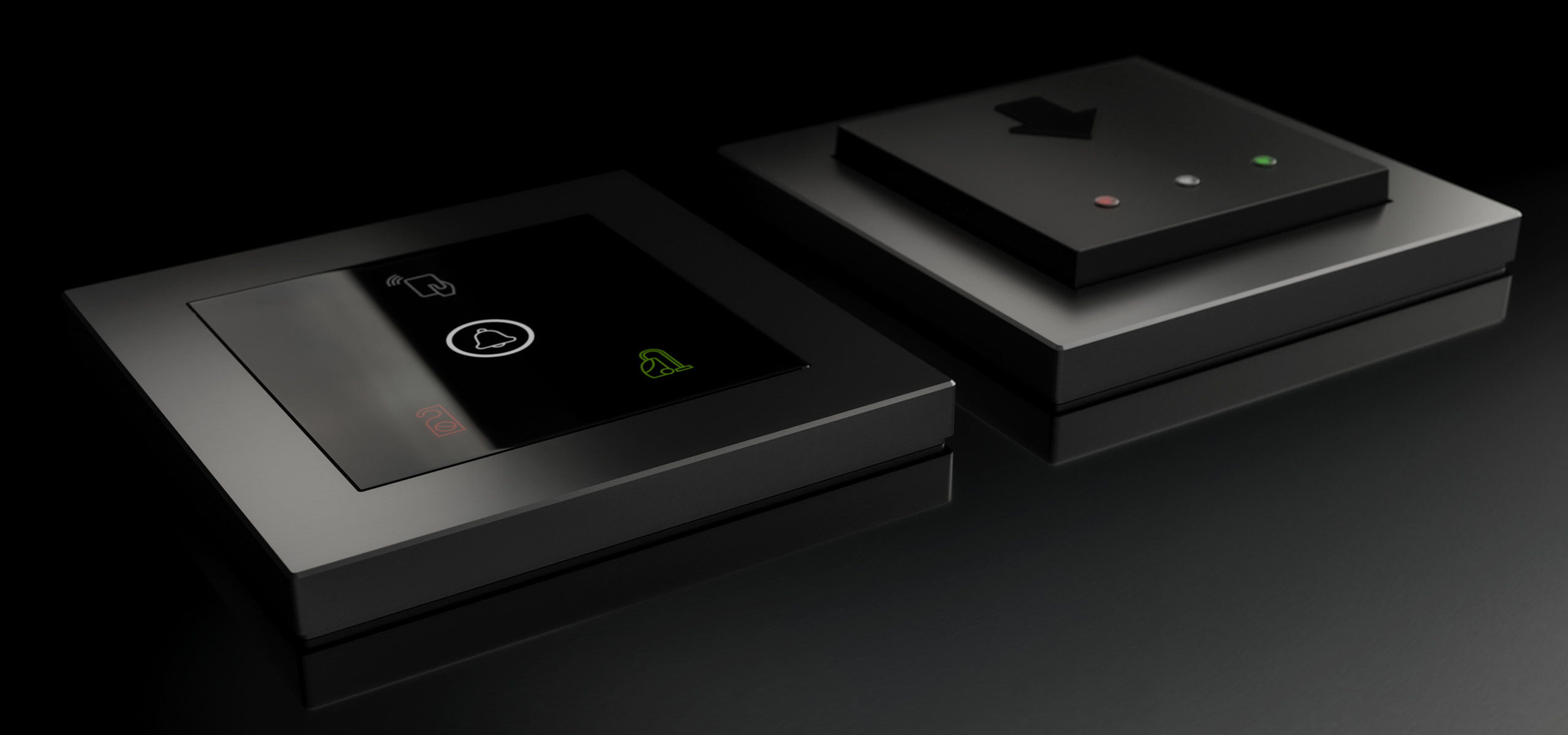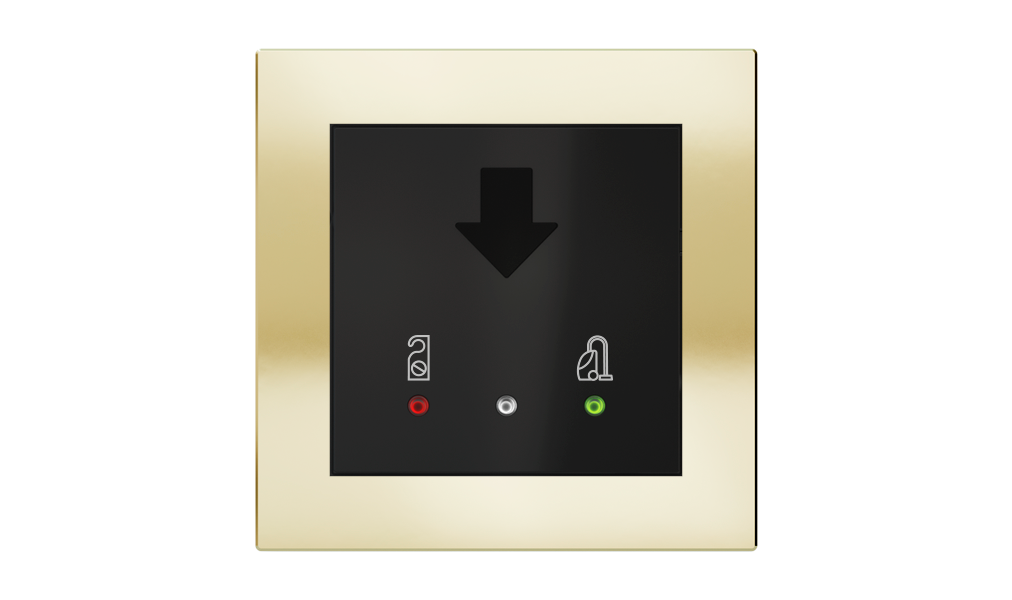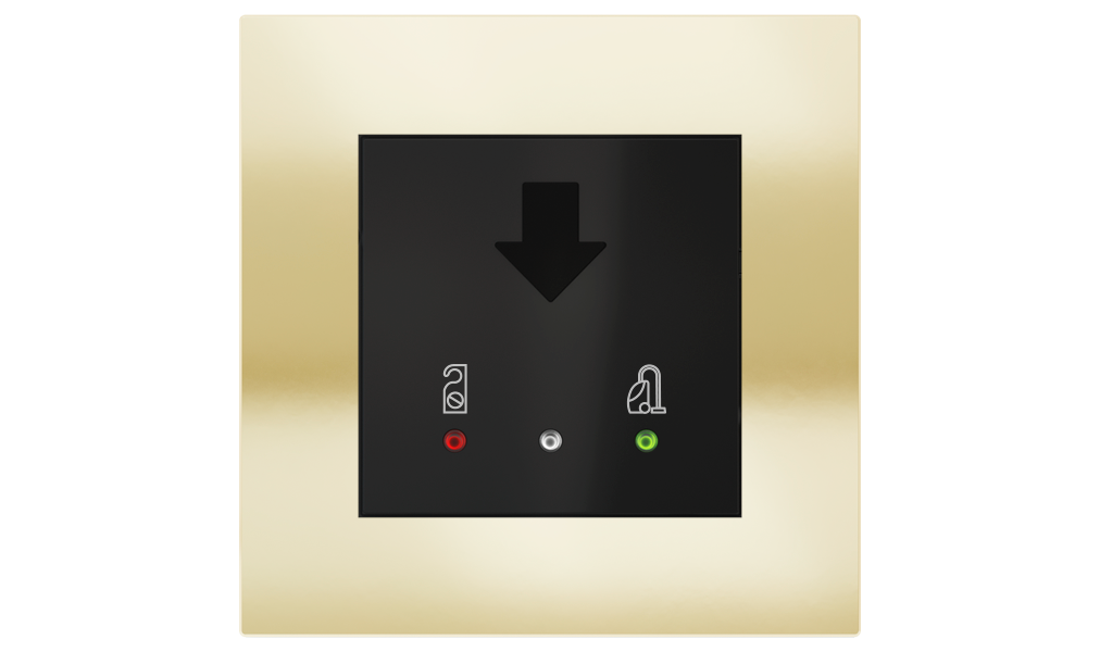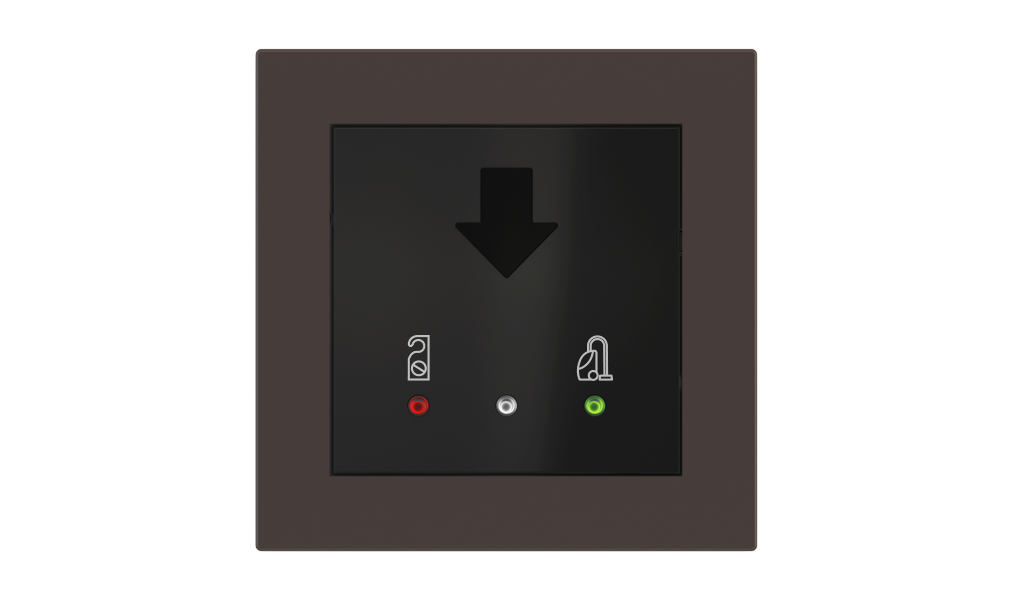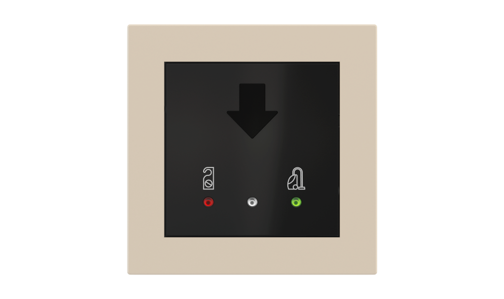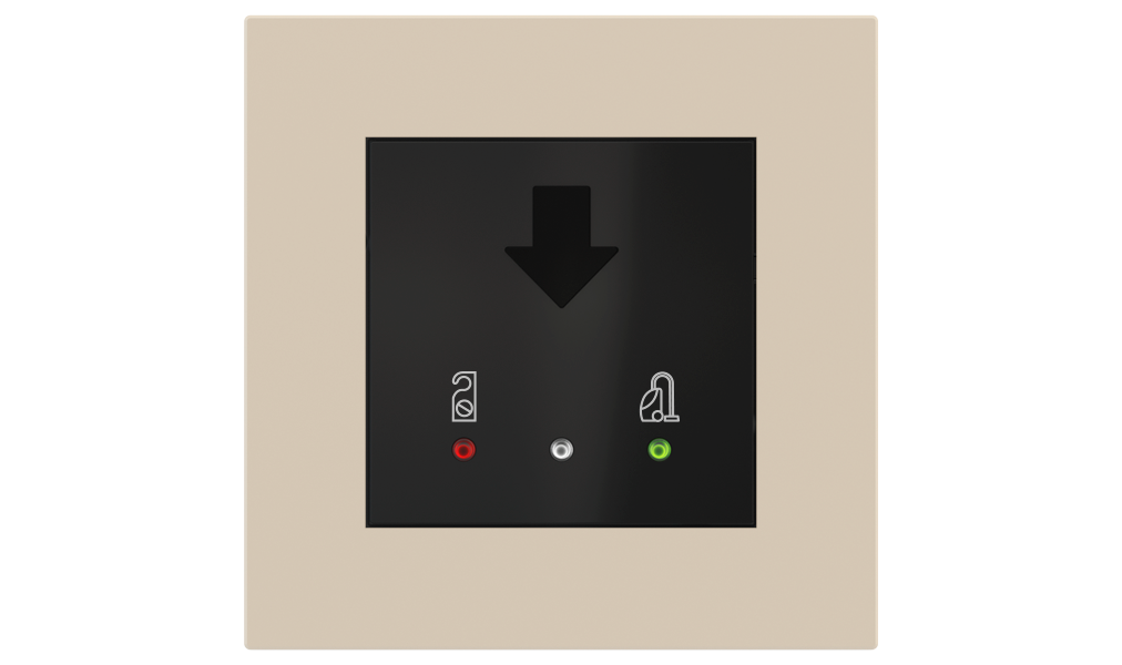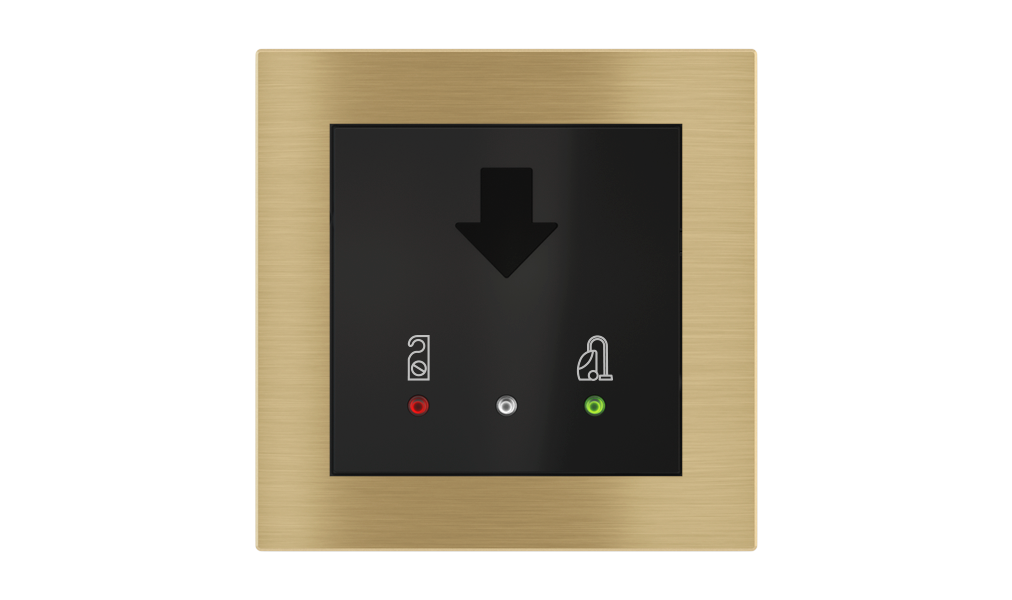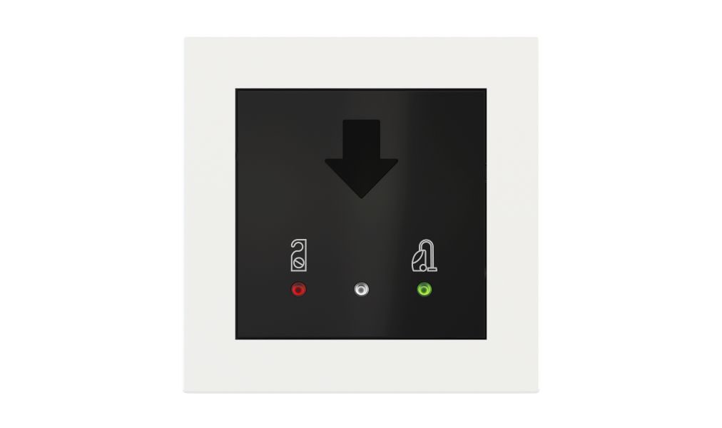 Vonkajšia čítačka, inštalovaná pri vstupe do izby, slúži na autorizáciu hostí aj personálu. Šifrovaná komunikácia KNX Secure zabezpečuje maximálnu ochranu proti neoprávnenému zásahu do systému. Podsvietený displej prehľadne zobrazuje stavové symboly DND – Nerušit (červená LED) a MUR – Úklid izby (zelená LED). Súčasťou je aj programovateľná RGB LED signalizácia a integrované tlačidlo zvončeka.