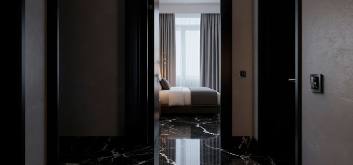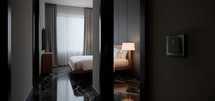 Vnútorný RFID držiak kariet sa inštaluje vnútri izby, detekuje prítomnosť hosťa a automaticky aktivuje technológie v miestnosti. Po vložení karty sa spustia elektrické okruhy, ako je osvetlenie či zásuvky, a systém upraví režim klimatizácie alebo vykurovania. Rovnako ako čítačka aj držiak kariet podporuje KNX Data Secure, čím zabezpečuje bezpečnú a spoľahlivú prevádzku celého riešenia.