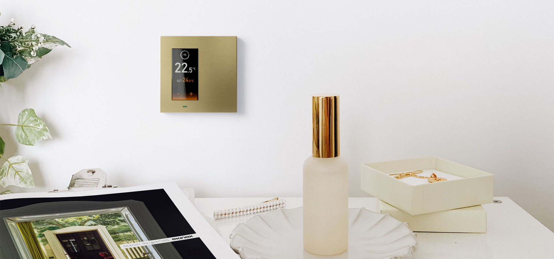 Senzor priblíženia bezpečne detekuje vaši ruku a zapne obrazovku až v prípade potreby. V klidovém režimu tak ovládač nijak nenarušuje atmosféru interiéru. Dotykový ovládač vám dává haptickou odezvu a simuluje tak pocit stlačeniu tlačidla. Ovládač má integrovaný termostat pre reguláciu vykurovanie, chlazení i ventilace.