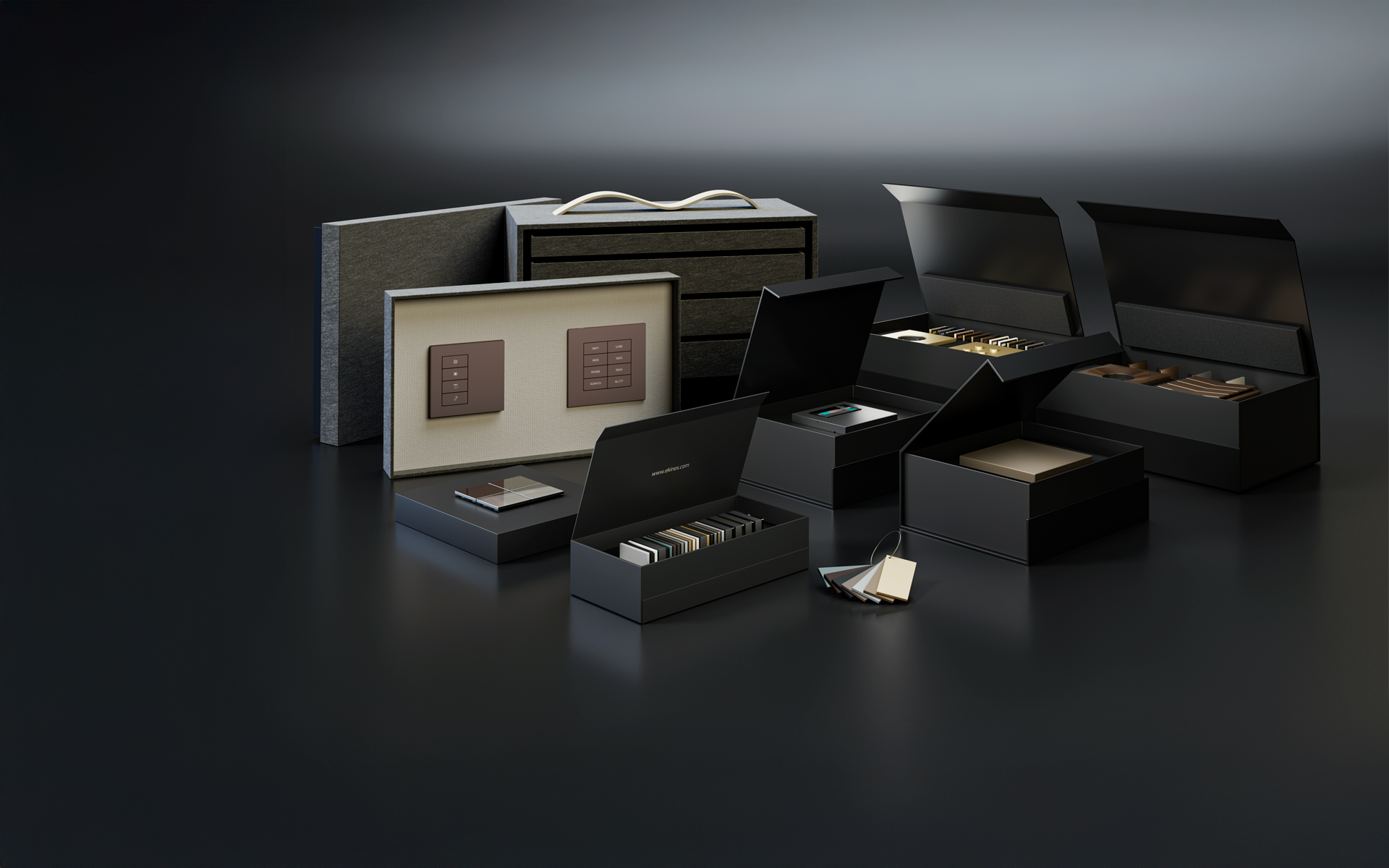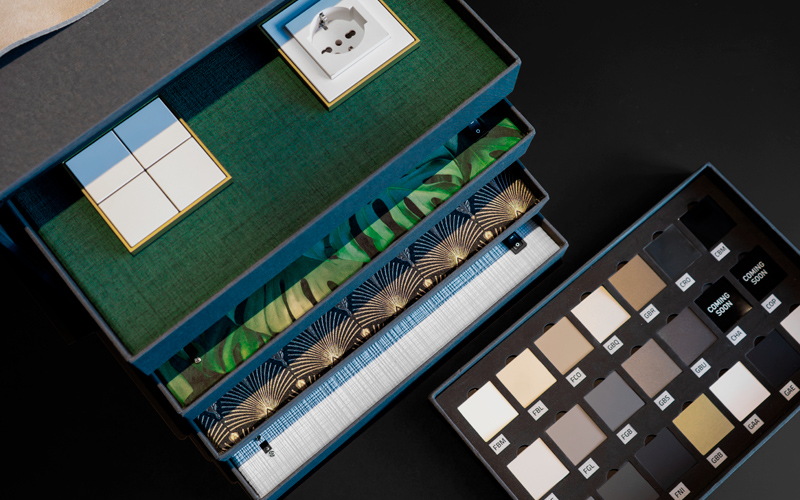 Niekoľko variantov vzoriek ovládačov z rôznych produktových radov a materiálov. Súčasťou je aj vzorkovník materiálov.