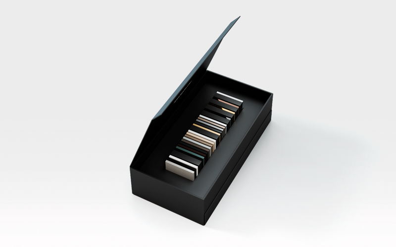 Glam Box obsahuje vzorky brúsených kovov, špeciálne upraveného kovu Metal HT a materiálu Fenix NTM®. Vzorky materiálov ponúkame vo veľkosti štvorcového tlačidla (TQQ) zo série FF.