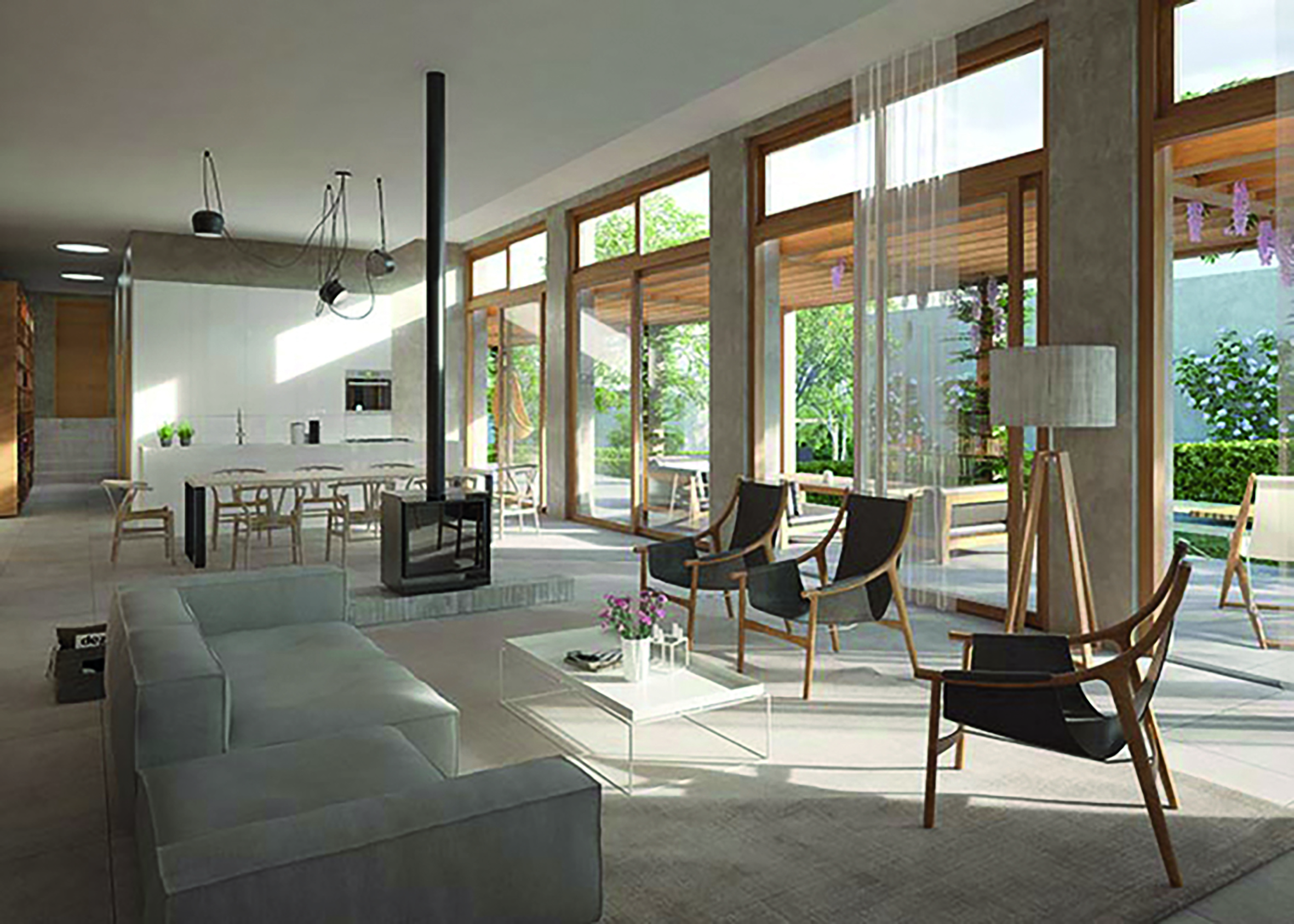 Interiér je navrhnutý tak, aby prirodzene nadväzoval na záhradu a tvoril plynulý celok bez bariér. Dispozícia zahŕňa tri alebo štyri spálne s vlastnými kúpeľňami, šatňami a dostatkom úložných priestorov. Veľkoformátové okná a výška stropov 340 cm dodávajú interiéru svetlo a vzdušnosť.